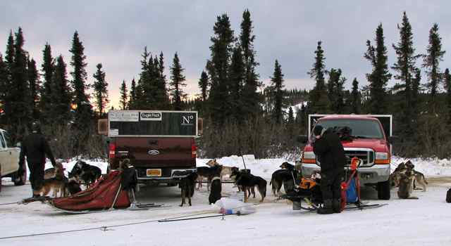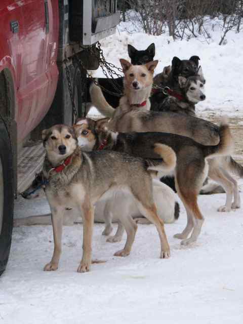 The veteran dogs are very keen to see the trucks being loaded, because they know it means they’re going somewhere fun. You can see ChaCha is standing as if to say “Let’s get after it!” Her daughter Olivia — standing behind her — doesn’t seem so sure. Beemer — the youngest Iditarod veteran — is cool, calm and collected. Dingle — a real up and coming lead dog — is taking it all in stride. The trip was very successful on all counts, and the mushers report that they all had a good day.