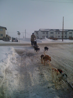 The challenge was mushing in and out of Nome “city limits”. The City Ordinances (from the year 1902) state that all dog teams must wear “bells” when they come through town. We aren’t sure if this team was legal…. Ranger and Skittles in lead, Pud and Hank in swing, Tony and Meg take up the rear position and Tom on the sled.