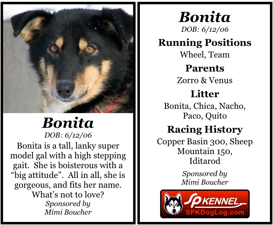 Bonita is one of the rock-stars of SP Kennel, but that doesn’t keep her from being a bit of a Barbie doll. Bonita is known as the playful ditz, high-stepping her way down the trail, so it’s a good thing that teacher Barbara Boucher has signed up to be her ‘tutor!’ Barbara, also known as Mimi by her three granddaughters, will be in Anchorage for the Teacher’s Conference at the Iditarod start, so Bonita looks forward to seeing her there!