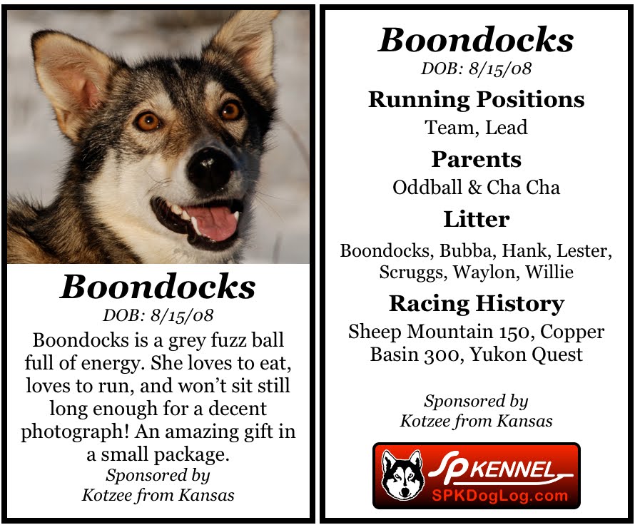 In just her first season of racing, little Boondocks has been making a name for herself by racing in the Sheep Mountain, Copper Basin, Yukon Quest, and now Iditarod…and she’s only two years old! However, she’s not only receiving human recognition, but she has canine fans as well. Kotzee from Kansas has decided to sponsor Boondocks’ racing season. Boondocks wishes she could see Kotzee at the Iditarod start but thinks that Kotzee’s person Yo-Lynn will be a good replacement!