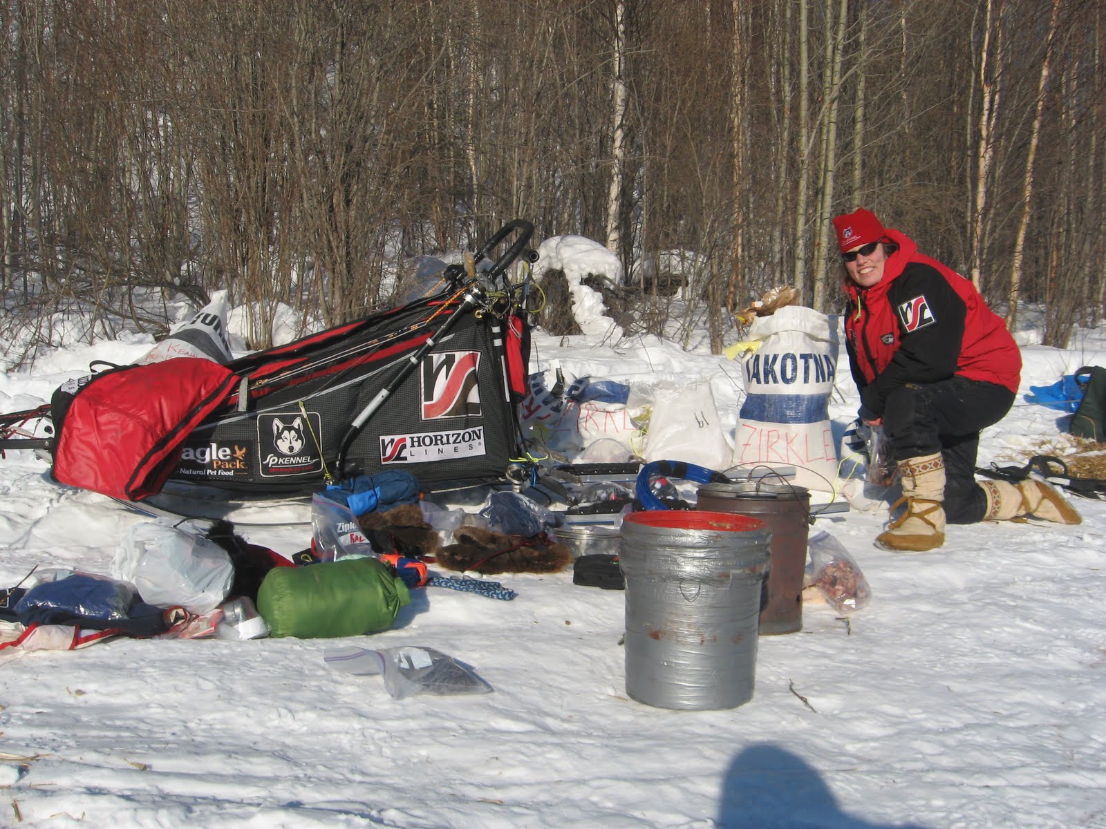 Mandatory 24-hour Rest Stop We pulled into TAKOTNA . Fifteen teams had arrived there before us. We parked high up on the hill overlooking the village and the river. It was still the middle of the night and the stars were bright – just gorgeous! I had pre packed a lot of dog food and snacks for this checkpoint in hopes that I would take my 24 hour layover here. It looked like that would be the smartest move in terms of weather conditions and trail times. So, I snacked the squad with a watery broth of meat and fish right away. I wanted their hydration to be a priority. But, they needed some calories with that, so I grabbed some Eagle kibble and sprinkled it in little piles on the snow for every dog. They loved that! So I added more and more as they gobbled the dog food off the ground. Soon they all had full meal – kibble and water with snacks. Perfect. I rubbed down all of the dogs with a massage balm called Algaval. I started with their feet, and worked up their legs to finish up on their backs. This took me quite a long time. I’ve learned in the past, the start of your 24 hour rest is the best time to learn about any soreness in your dogs or yourself. That way you can tend to these issues right away instead of being surprised by them when you are ready to leave. Rose was particularly sore on her front left. I couldn’t find the spot that hurt, but it seemed swollen. I massaged and rubbed everywhere. I even borrowed some holistic anti inflammatory rub from Michelle Phillips. She practically had a “witch’s bag” of oils, ointments and rubs in her sled bag. (Note: Michelle also finished the race with more dogs than any racer this year. Thirteen.) After a few hours, my dogs were blanketed, despite the warm temperatures, and they looked comfortable resting between Bruce Linton’s and Pete Kaiser’s teams. I went into the checkpoint headquarters to grab a bite to eat. Allen had just arrived at the checkpoint so we sat together. He is always very chipper and humorous during Iditarod. I’m sure that’s why everyone likes to travel with him. He was sharing a few stories of various calamities on the trail. Allen is always helping people, picking up other people’s gear and generally “in the right place at the right time”. His mindset during the Iditarod is entirely different from every other race of the season. This is the only race that he is not necessarily trying to win. Yes, he’d like to be competitive, but the individual dogs that make up his team are not of the calibre to win. I think this year especially, after a grueling Yukon Quest in February, his “more casual” Iditarod race outlook was refreshing and fun for him and those around him. The volunteers at TAKOTNA strive to offer 5 star cooking here in “the middle of no where” and they do a darn good job. I ordered breakfast – my favorite meal. Mike Williams Jr. was eating with us, so we chatted with him for a spell. He is the son of long-time Iditarod musher, Mike Williams Sr. – from a village in Western Alaska. Allen has raced with Sr. quite a bit in the past few years. But, Jr. was taking the team to a new competitive level this season. He had a nail biting 2nd place finish in the Kusko 300 Sled Dog Race in January and it looked like his dog team was still in perfect condition. He said the heat bothered a few of his heavier coated dogs, but all in all they were doing well. I ate my eggs, toast and potatoes. Then I drank at least a quart of water. By this time, it was early morning and I was extremely tired. It had been 3 days since I had slept – except for three 30 minute naps. So, I grabbed my personal bag and my sleeping bag, and headed to find a warm spot to sleep. Most residences in Bush Alaska are small and the cabins allotted for mushers’ sleeping quarters are no exception. I walked in the door and turned on my headlight. There were bodies in every corner – some snoring, some in tight little balls. I moved a table to the side and created an empty spot on the floor in between two shelves that would make a cozy “nest”. I fought off my fatigue just a bit longer because there were a few more important things to do. My insulation layer from Northern Outfitters was damp with perspiration. It was still wearable in this condition, but if I dried it out, it would be much more comfortable. I found a spot to hang it up with my socks, gloves and hat. I turned my beaver mitts inside out so they could dry. I had sent out extra clothes in my food drop, so I had something to wear as these clothes dried. I then went through my personal bag and laid out anything that needed to thaw out: canine foot ointment, Algaval, my drinking bottle. I also took out my rechargeable headlight batteries. I packed enough battery power to make the entire journey, but since I found an available outlet, why not use it? Finally, I set my watch alarm for noon and tucked it in my new dry hat on my head and got into my sleeping bag. I laid down in with the hopes of sleeping soundly for 5 hours. Needless to say, I slept well. I woke up only once during my slumber because I was too hot. I had to take off a long underwear layer. Sleeping indoors is quite a bit different! When I did get up, I went to the team to look at everyone. They looked comfortable, so I didn’t bother them. I took my dog food bucket to the hot water source – a huge 55 gallon drum wood-fired water heater – and filled it with boiling water. I made a fish broth again and let it cool for a short while. When I went into the checkpoint headquarters, my mom was there. She had flown to the checkpoint from MCGRATH and would be able to visit with me until early evening. So, I had another bite to eat with her and talked about the dogs. She even recorded me so that she could post “Updates from the Trail” to our website. It was fun to see her as part of my world. She was really enjoying being on the trail for the first time and talked to a lot of mushers and specta