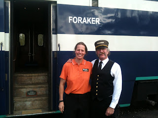 | Aliy is greeted by the conductor on Princess Cruises’ Denali Express. All Aboard! |