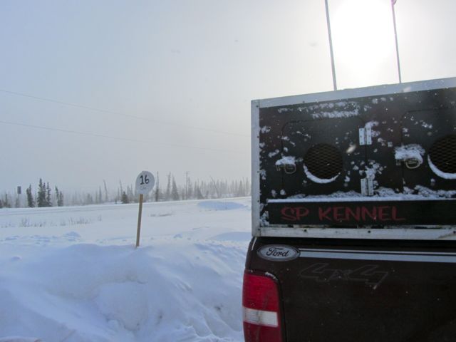 The team has arrived at Sheep Mountain Lodge after a seven hour drive from Two Rivers; the conditions on the drive varied from snowy and blowy through the Alaska Range to clear and blue through the Glennallen area. Right now, as you can see from the pictures below, visibility here is limited but it is expected to clear for the race start tomorrow.