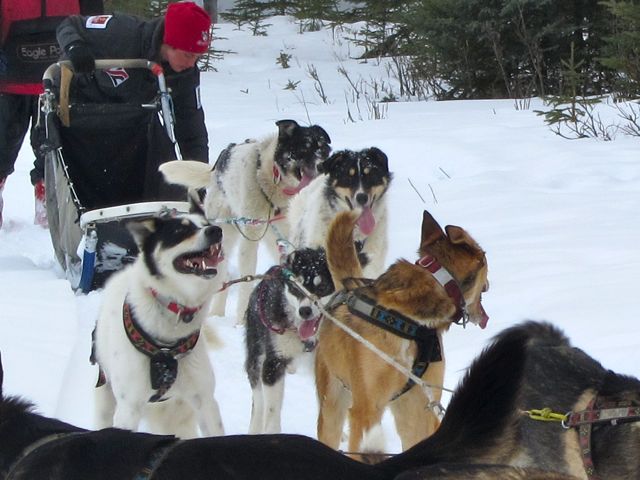 You will notice a more traditional harness and line set-up for the puppies, the traditional full-body harness and necklines set them up to succeed until they get the hang of it. Then they will graduate into the half harness and no-neckline system the rest of the team run in.
