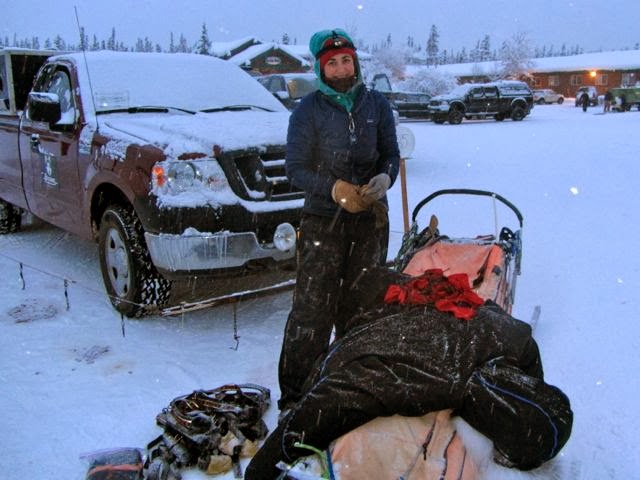 L-R: Meghan readies herself; the handler team waits at the Red Eagle Lodge in Chistochina