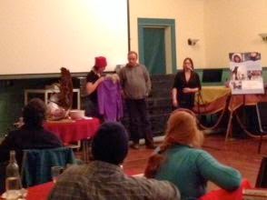L-R: Meghan receives Rookie of the Year award (a handmade anorak with fur ruff); and the Vet Care Award (a gold nugget from Joe and Wendy Fellers and a plaque)
