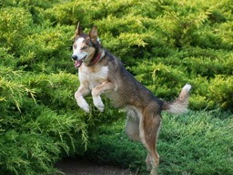 Honda running to the house after his horse manure excursion; Jumping thru the juniper.