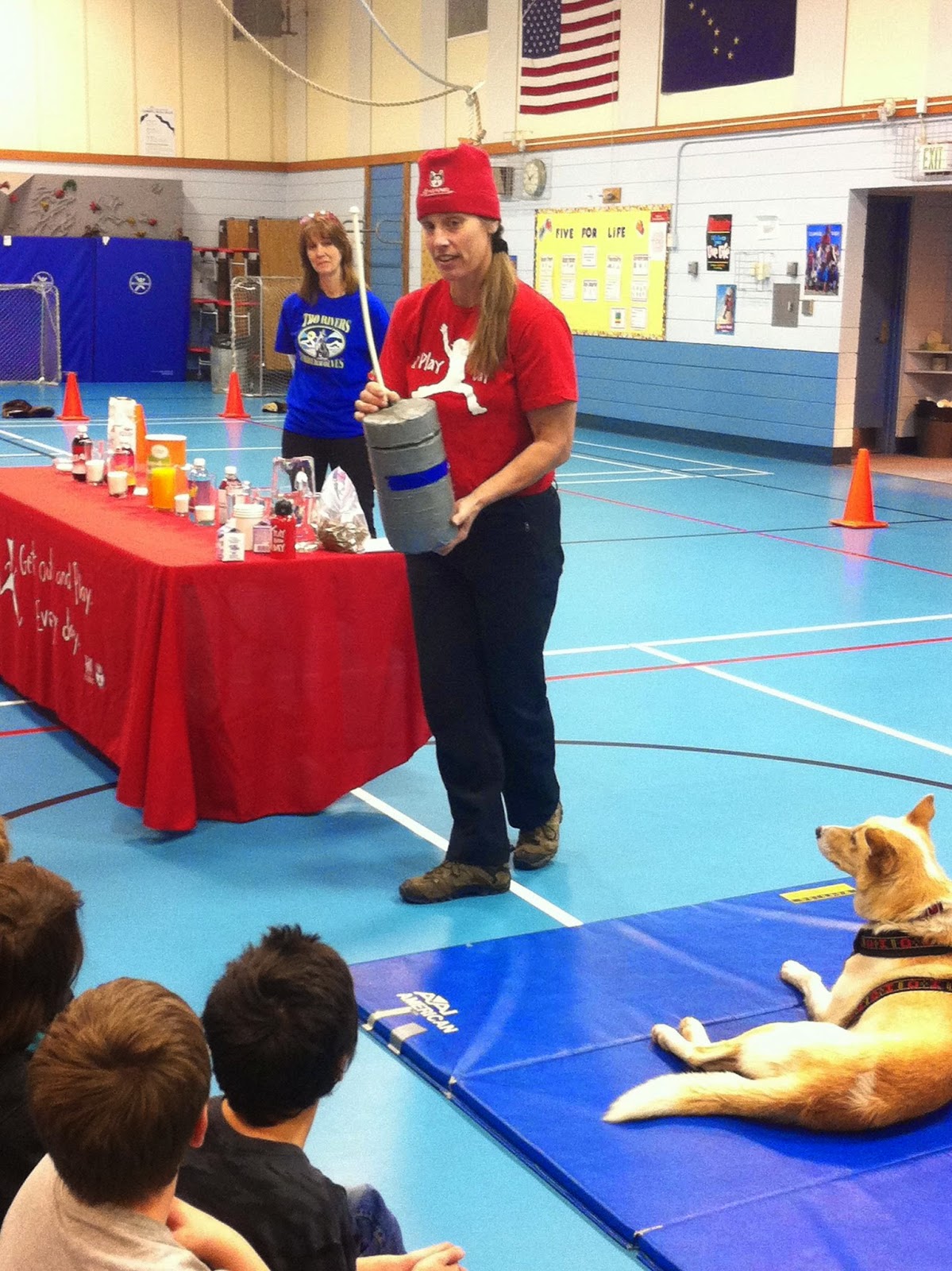 Aliy brought Beemer as well as SP K retiree, Stormy, to the seminar. She talked about choosing water as the healthiest drink for her and her dogs. The seminar ended with a “mushing wardrobe” relay. The kids had to put on a fur mushing hat, a pair of goggles and beaver mitts then run through orange cones to the finish line. There they had to drink a glass of water then ‘high five’ their team mate before he or she could run the course. Both teams — first and second place — got awards. The awards were dog biscuits that were given to Beemer and Stormy.
