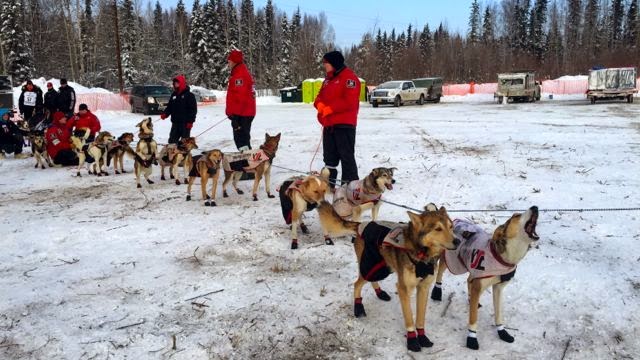 Felix and Sandy waiting; Biscuit contemplates Iditarod number eight