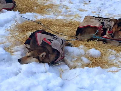It is very obvious when you see the team come into a checkpoint who are the experienced dogs and who are the newbies. Even before the straw went down the more experienced front end (Junior, Kodiak, Beemer, Boondocks, Lester and Viper, Chemo and Felix and Biscuit) and back end (Sandy and Olivia) were settling down for a nap while the yahoos in the middle/back, were still wide-awake; interested in what was going on with the teams next door. The last three to go down were Commando, who found a girlfriend in DeeDee Jenrowe’s team parked next door, and gazed longingly at her, Chipper who sat up for most of the time, nodding off now and again and waking herself up, and Driver who was just too excited about having new friends to meet. Pepe circled for a while taking all the excitement in and Dutch finally flopped himself down off his straw and made himself a great pillow in the snow.