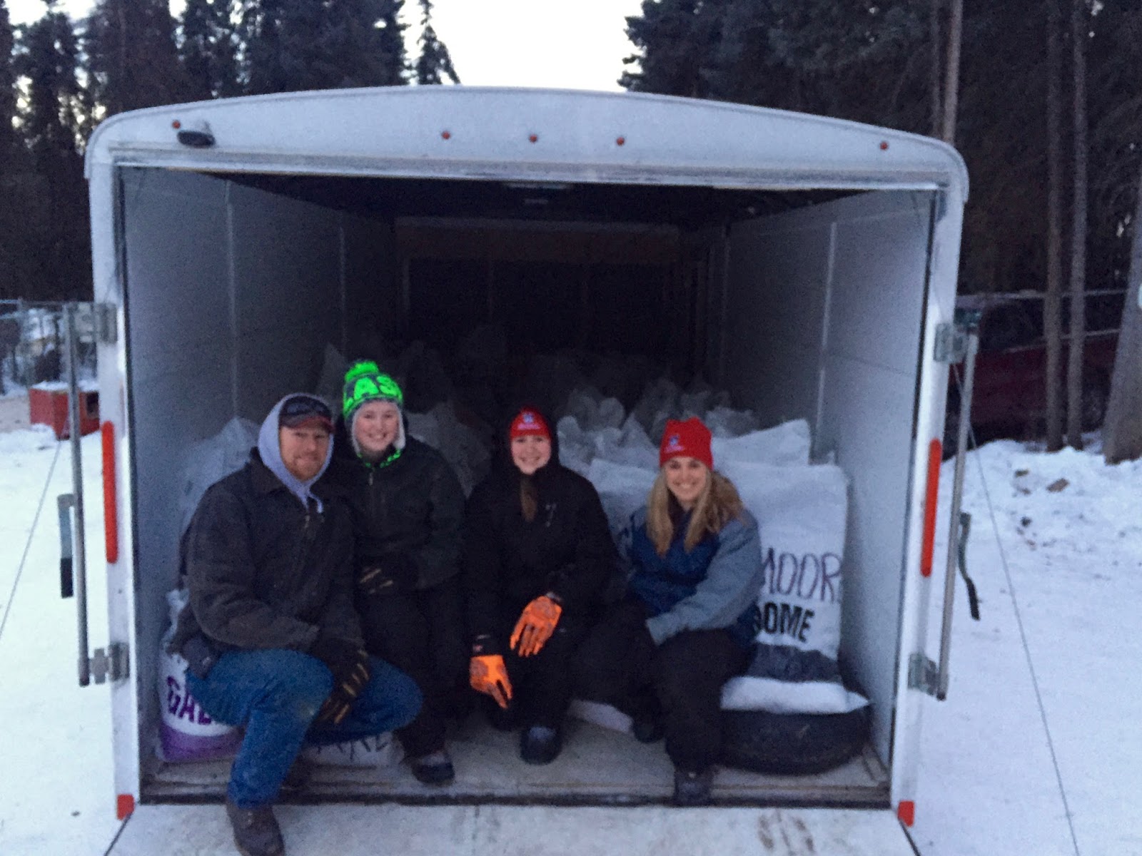 Our special thanks to the Earle Family: Brian, Tami, Madi and Mykena for the use of their trailer and man/woman power to load, unload and stack the bags in Fairbanks. Thanks team, we really appreciate your help!!