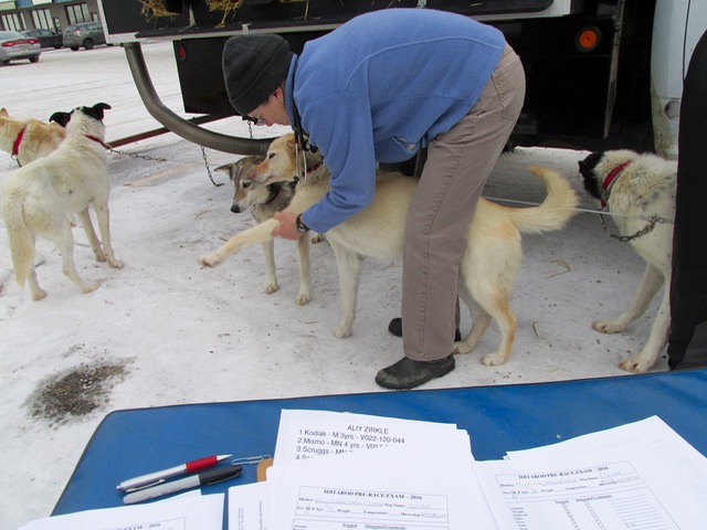 All dogs that run the Iditarod have to pass every test and be declared fit to run. As for the musher… there is no medical involved but they are drug tested in the White Mountain checkpoint for banned substances. Also, rookie mushers must have qualified to run the race by being ‘signed-off’ by officials in a number of shorter qualifying races. This is to ensure the musher has the skills to take care of not only him or herself, but the 16 canine athletes in their charge.