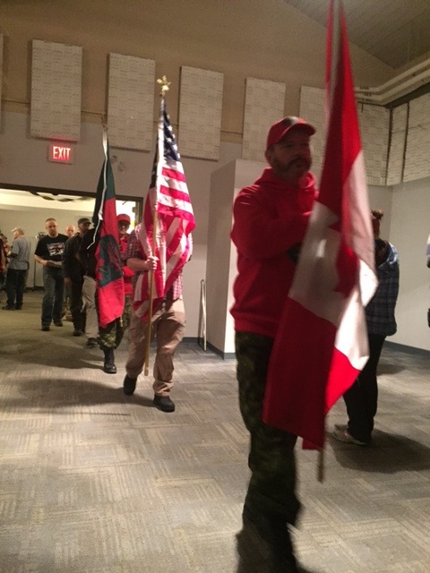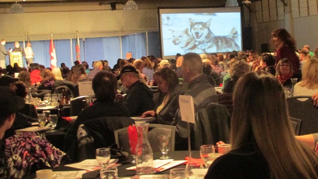 The Canadian Rangers lead all the mushers into the hall during the flag procession then we were all welcomed by Chief Doris Bill, Kwanlin Dun First Nation and Michele Telep, Ta’an Kwach’an First Nation, both speaking about how the Yukon Quest is important to their communities. After the national anthems of Canada and USA, representatives from the Ministry of Tourism and Culture, the local Yukon MP and the Whitehorse Mayor also spoke about the Quest and it’s impact on the Yukon.