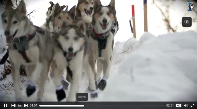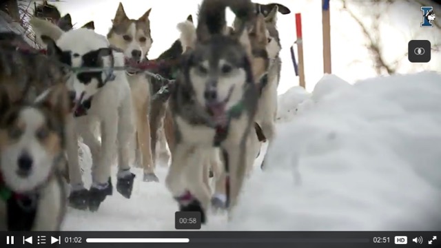 Both teams also feature in the latest “Run Dogs Run – Finger Lake to Galena” video which is exciting! There are a lot of gorgeous shots of the Red Team and a lovely, close up shot of the Black Team coming down a hill early in the race – maybe in the Happy River Steps area. In it the team was led by Quito and Chena with Lester and Junior in swing, Chica and Nacho, Sissy and Spark, Tinder and Lydia, Nomex and Iron, then I can’t quite make out the order at the back but see Champ’s happy face! See below a couple of screen shots from that video showing the Black Team.