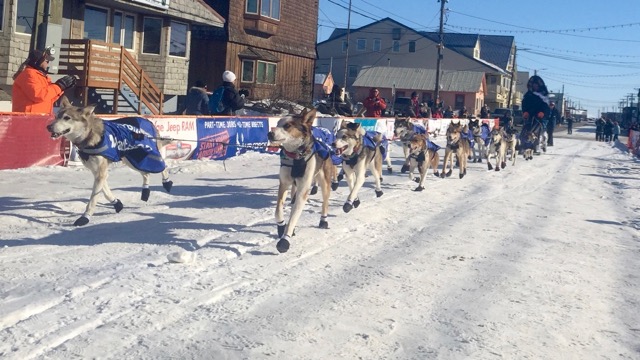 Chena was in swing with Lester at the finish – Awesome Queen Quito and Junior leading the way into the finishing chute in Nome: