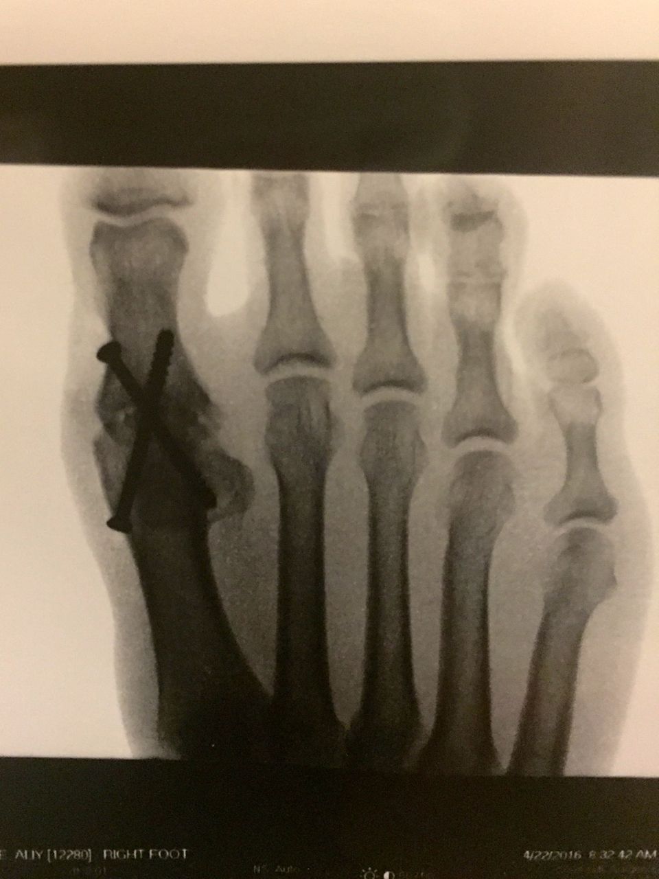 The surgery went well — according to Ken — who drew husky faces on my now bionic right foot and showed us the X-rays on which you can see the hardware. The surgery basically removed the big toe joint (which was a mess) and then screwed the two bones together. Now they must fuse – like a broken bone would do. So, that means it will be 4 to 6 weeks of non weight bearing on my right foot.