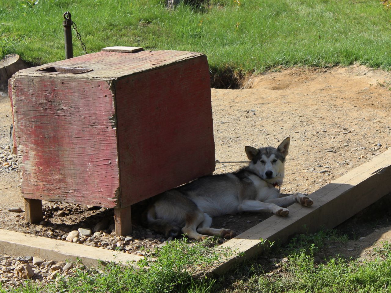 The rain has been constant in July and August in Interior Alaska. But, there have been one or two nice sunny afternoons. Our Alaskan Huskys certainly are not accustomed to the heat that these rare rays of sunshine bring – so they hide as much as they can. No “basking” for these doggies!