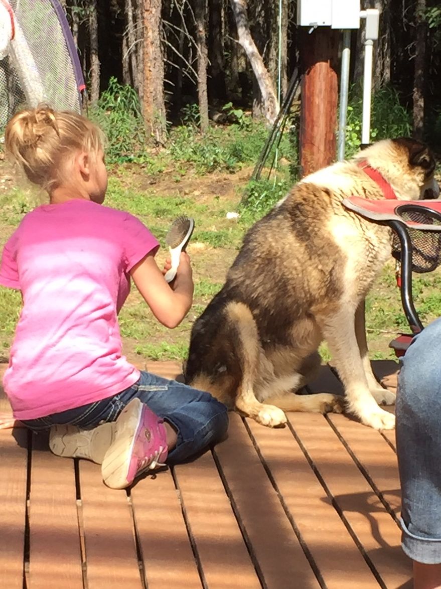Earlier in the summer, the Voiles Family visited the kennel. The spent much of the afternoon grooming Scruggs and Chena. Thank you very much girls!
