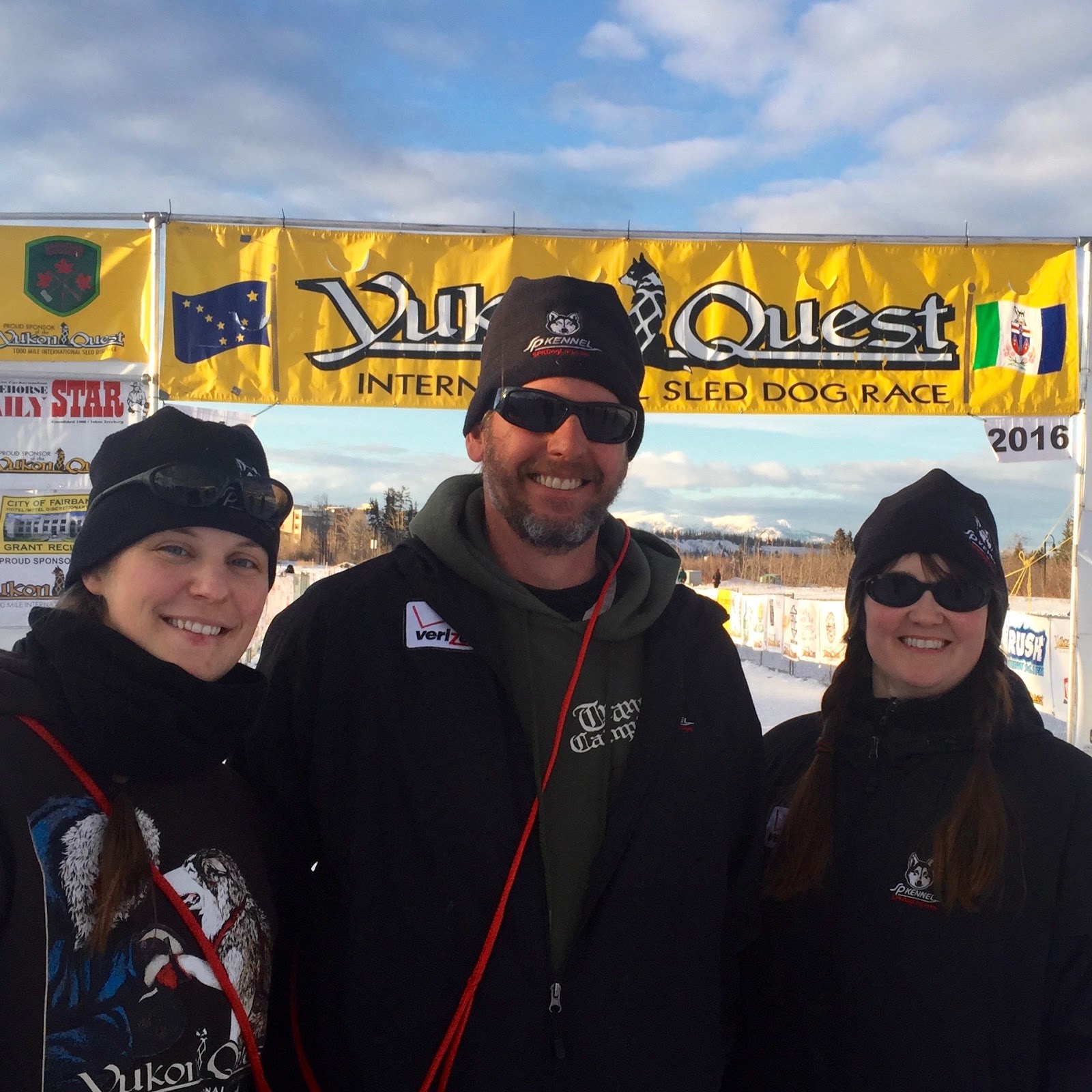 Mark will be driving Hollywood (SP Kennel Dog Truck) to all the races. Photo on the right is at the 2016 Yukon Quest finish line in Whitehorse, Canada. L-R: Bridgett (Allen’s daughter), Mark and Moira.
