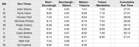 Allen and the SPK Black Team are on their way to the finish line, with speedy Ryne Olson hot on their tails. A 26-minute lead can wither in a hurry during the last, long stint. Matt Hall has not yet checked into Mendeltna, which means he is now well behind the lead. I have no ready explanation for that until I see his run time from Tolsona, but he has already taken all his required rest and will (probably) not stop in Mendeltna.