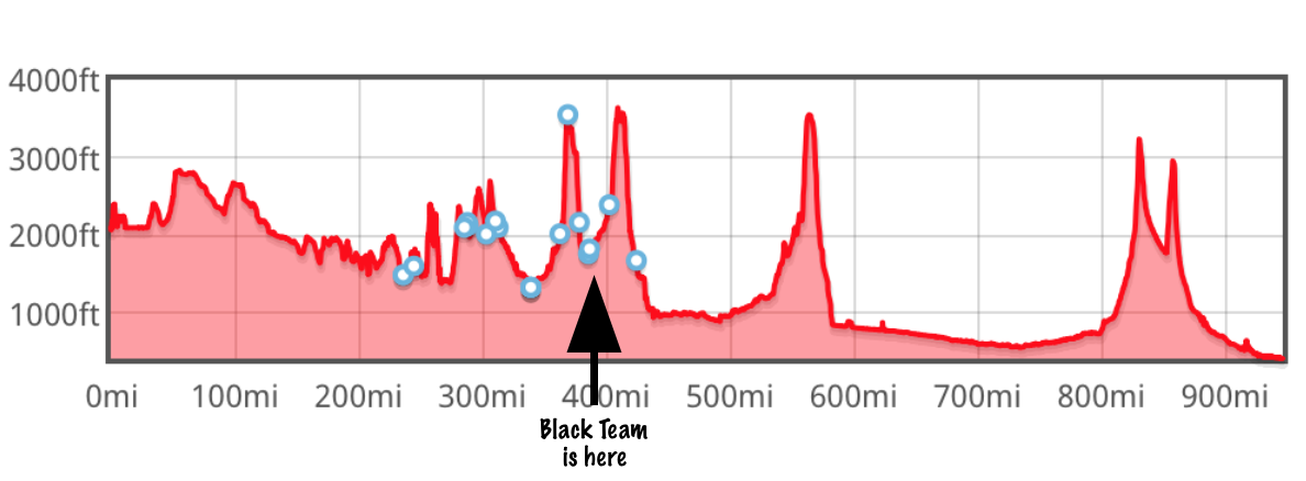 After Scroggie Creek the teams climb through the Black Hills before another big climb up King Solomon’s Dome. Allen and his team are currently camped between the two ‘summits’ with around 50 miles till Dawson City. This elevation map shows the summits clearly and you will see the Black Team’s dot at their current camp spot.