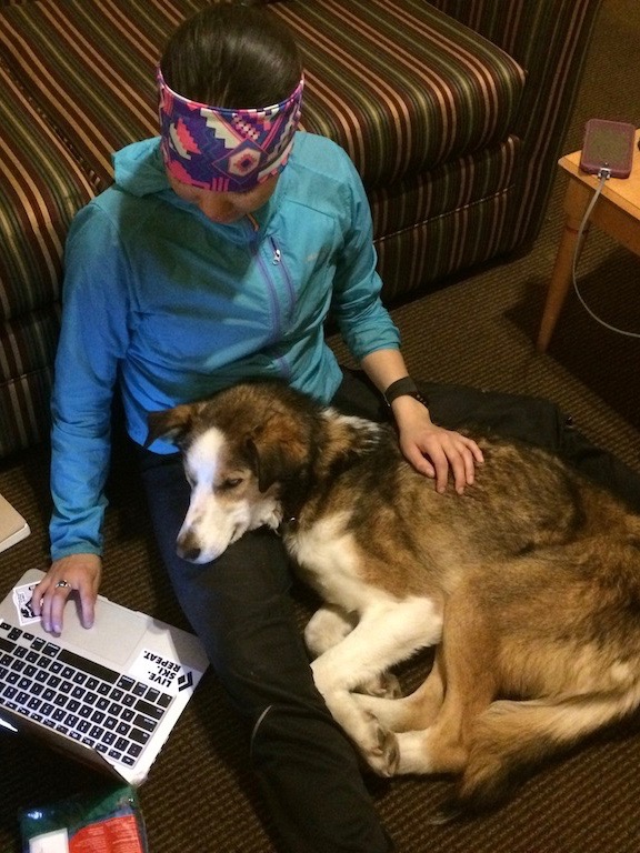 L – R: Mal and Hotshot in Anchorage before flying to Nome; Husky “helping” with Homework!