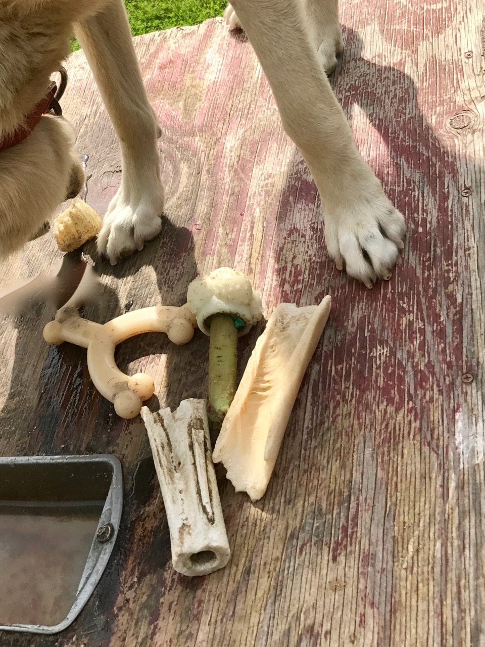 They also have their chew toys and bones. Every dog has at least one chew toy, but most have a collection. Five has five toys – it only seemed logical. (His pile pictured to the left.)