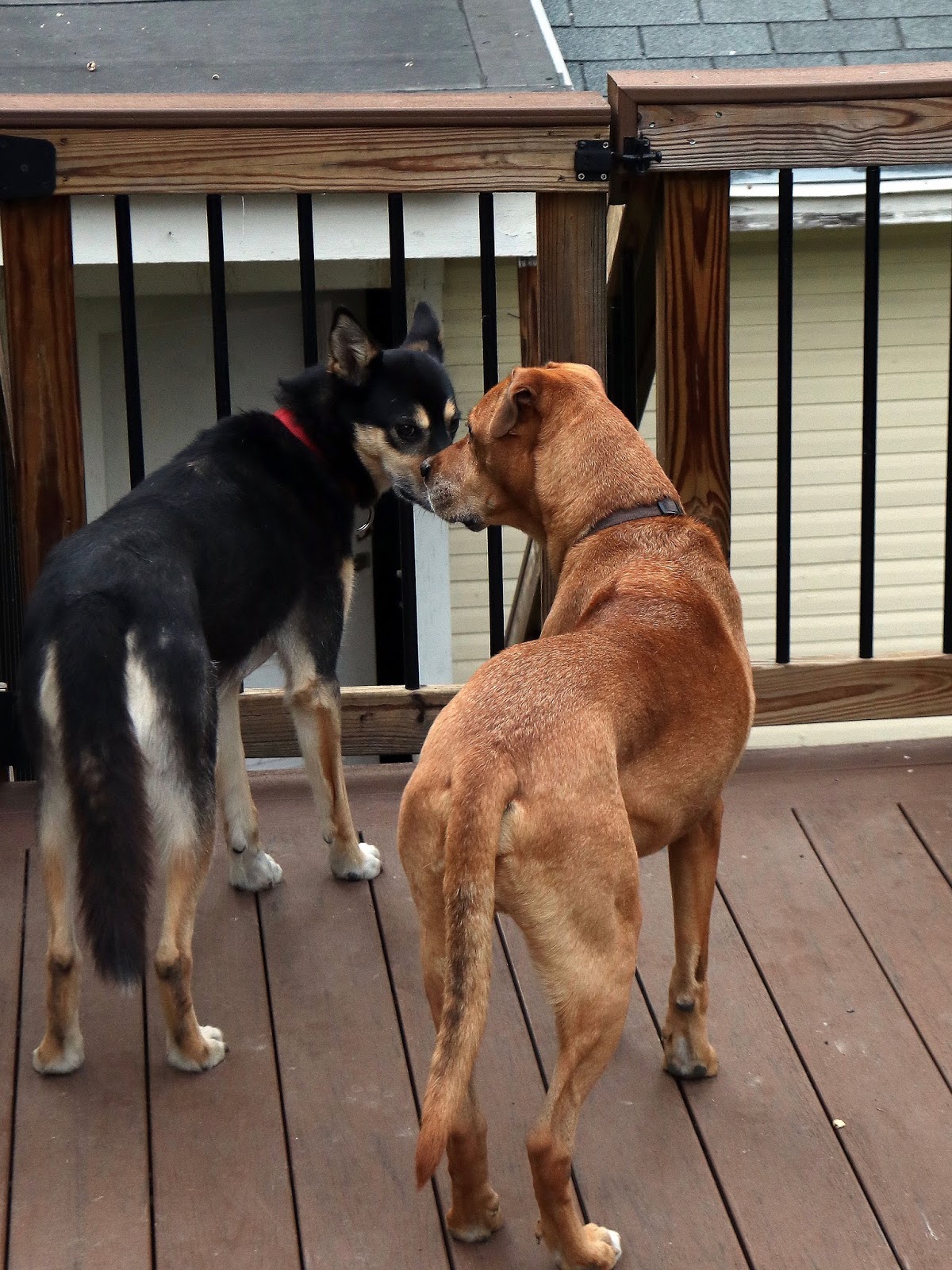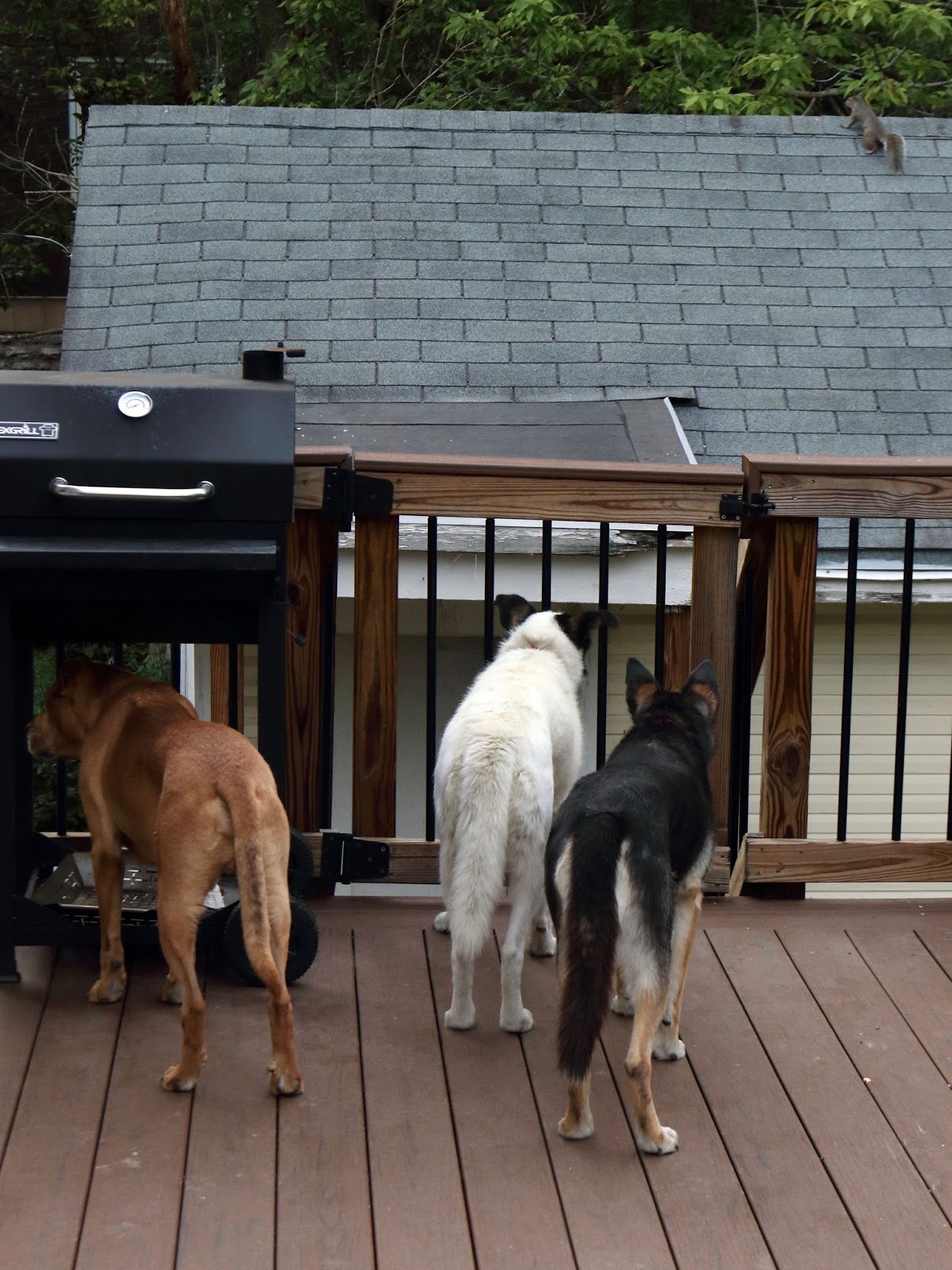 Here’s the team (Noodle, Sissy and Scooter) taking on the dreaded squirrels. This is a fun activity while out on the deck.