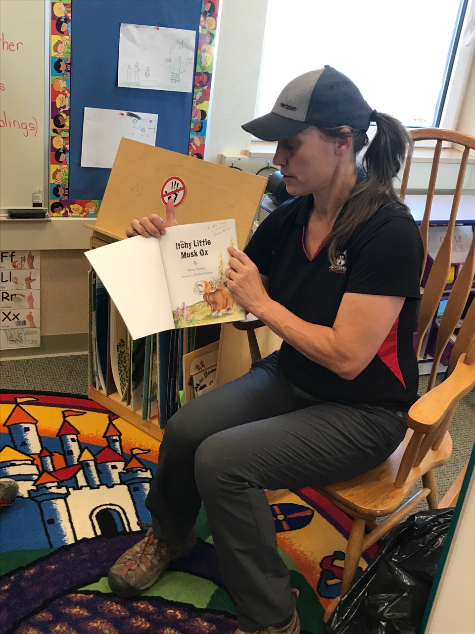 I read books to the youngest students. My favorite book to read the 1st through 2nd graders was the Itchy Little Musk Ox by Tricia Brown. It was especially poignant as there was a small herd of musk ox across Golovin Bay while I was there. I should mention that all the books I brought to the villages were purchased by ExxonMobil – so a big thanks to them!