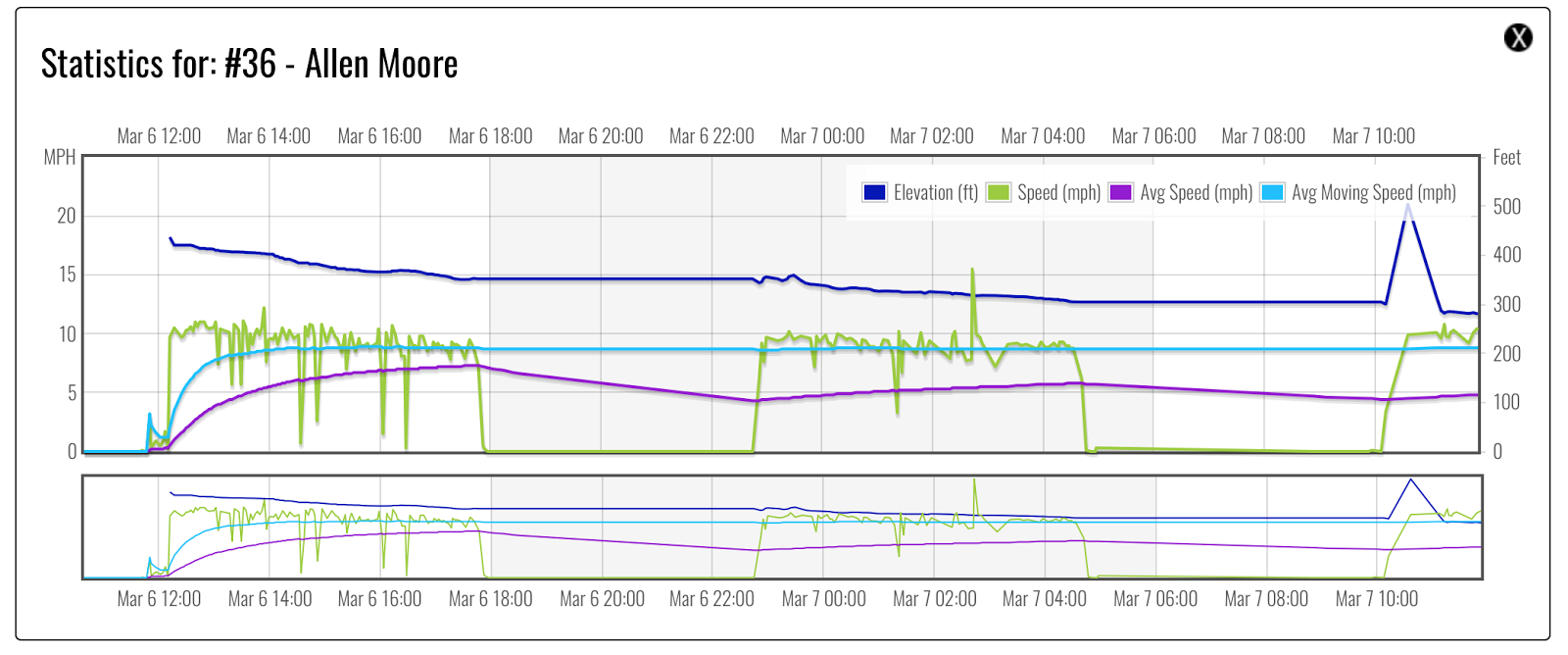 Below you can see clearly the rest times, and all the little “blips” down are when the tracker captures snack breaks.